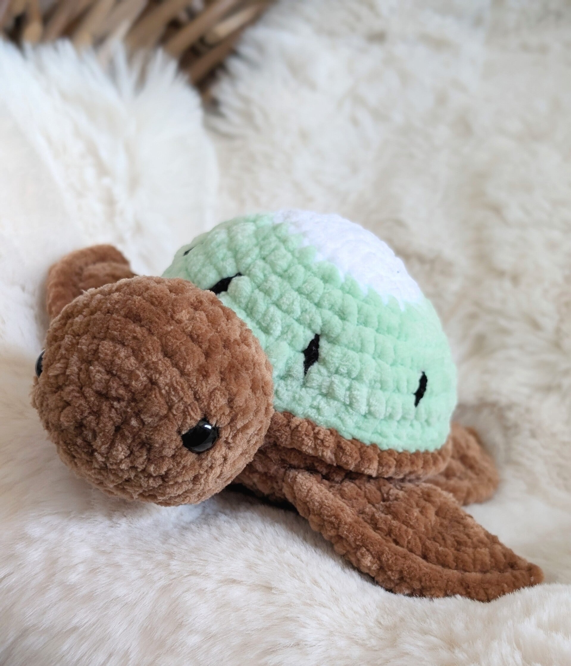 Diese einzigartige, handgehäkelte Schildkröte ist eine Hommage an die erfrischende Kiwi-Frucht. Mit ihrem flauschigen, grün-braunen Panzer und den kleinen, schwarzen "Kernchen" ist sie ein echter Hingucker.
